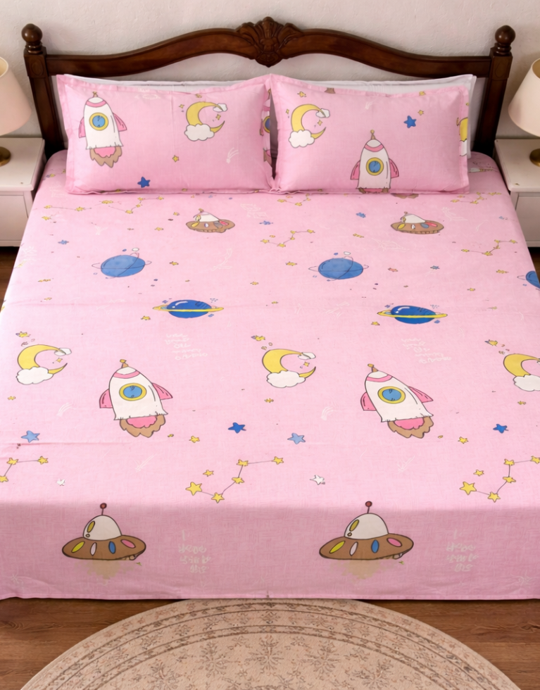 Dreamy Space Kids Bedsheet – Pink | Rocket & Moon Print | Soft Cotton Kids Bedding