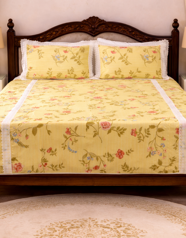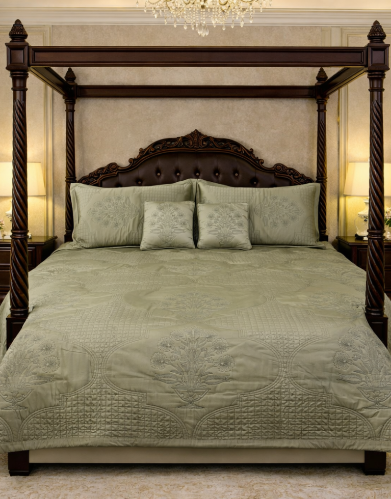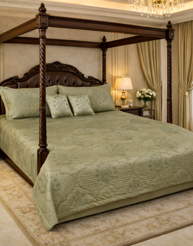 This one is a soft golden-green embossed–quilted & embroidered bedsheet with a calm, botanical, premium feel.