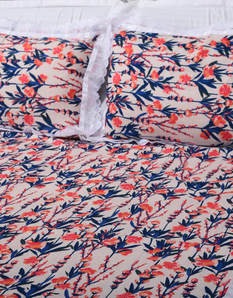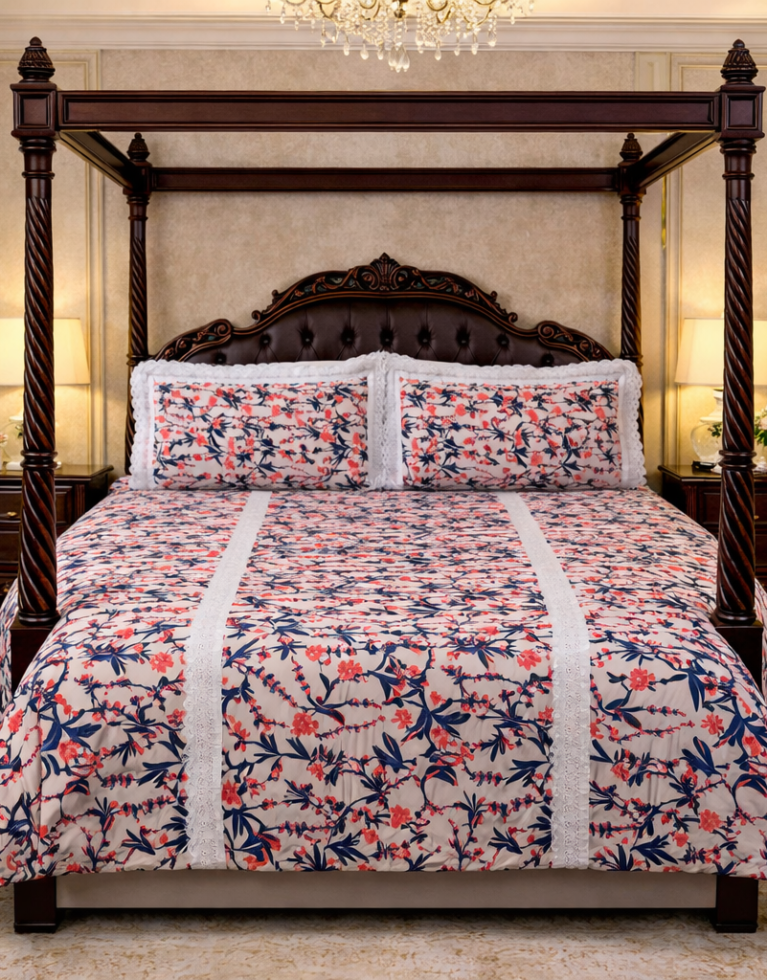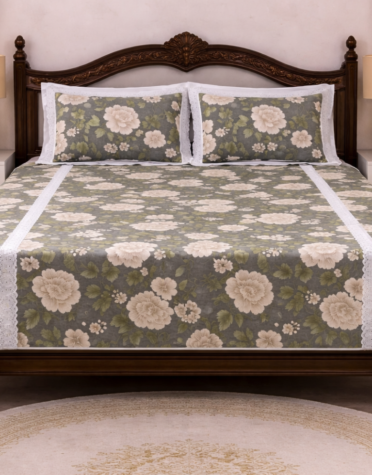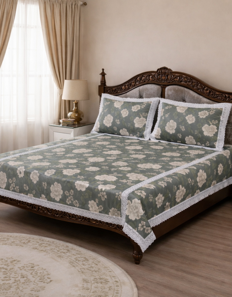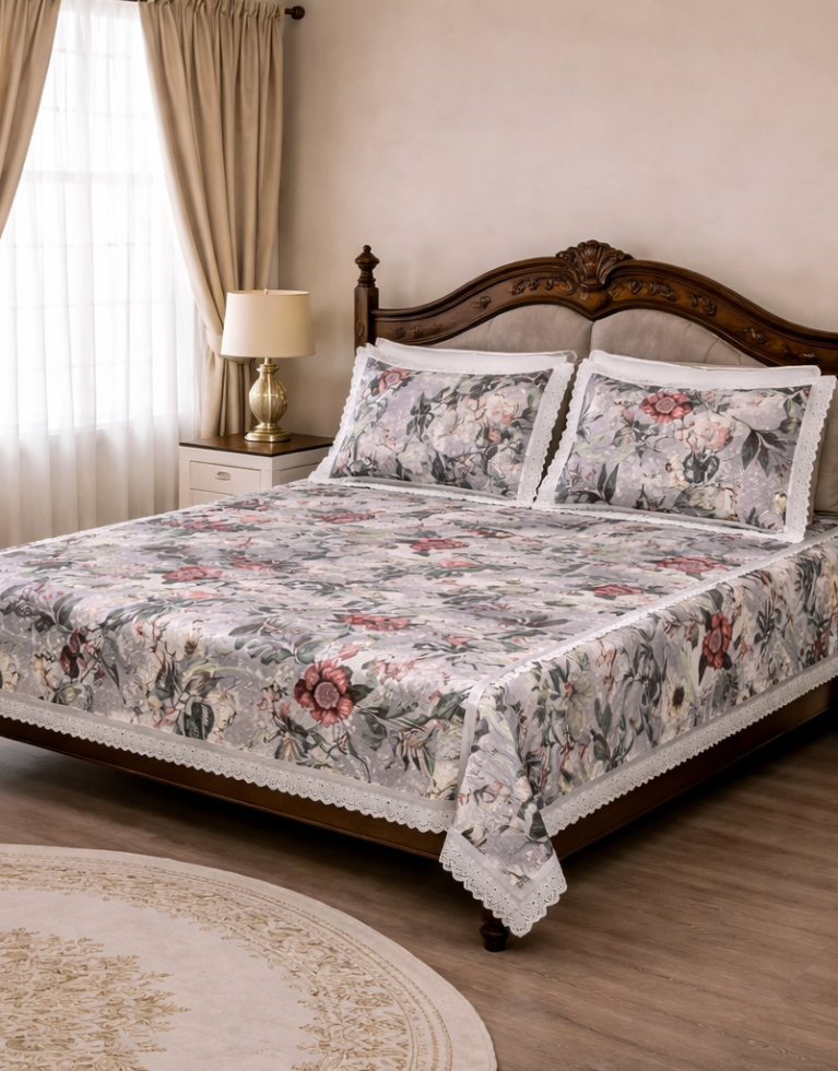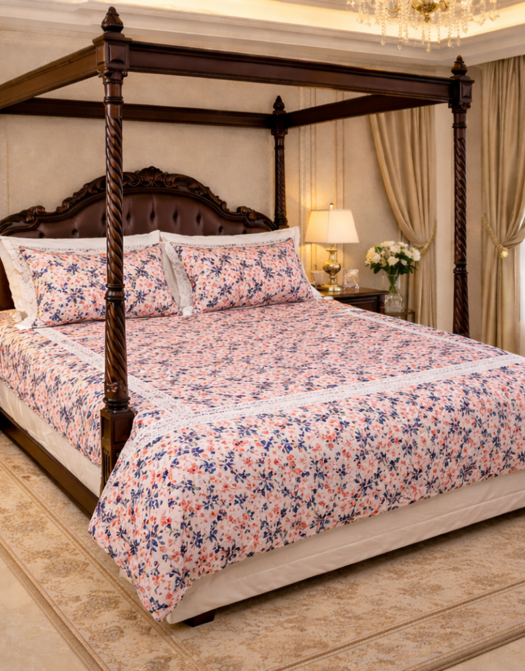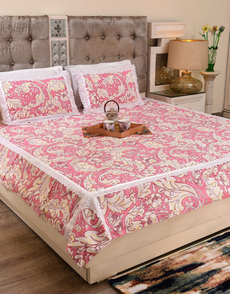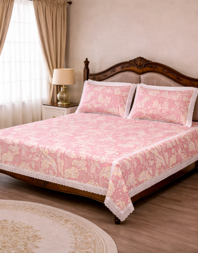 A soft pink floral bedsheet adorned with delicate white lace borders, crafted to bring a romantic, elegant charm to your bedroom. Perfect for everyday luxury with a graceful finish.