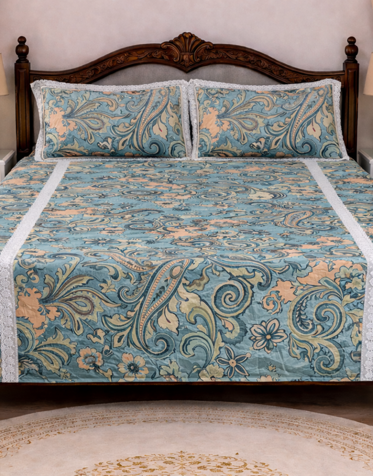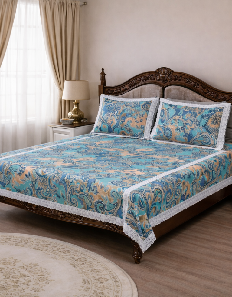 A warm amber-toned bedsheet featuring intricate paisley motifs and finished with delicate white lace detailing. Rich, inviting, and perfect for adding a touch of classic elegance to everyday bedrooms.