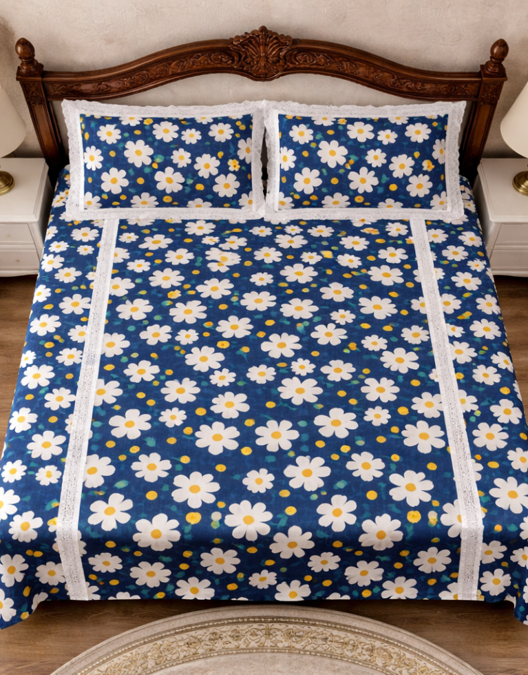 A deep navy bedsheet dotted with cheerful white daisies and finished with crisp lace borders. Fresh,