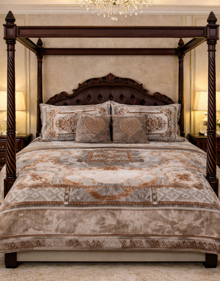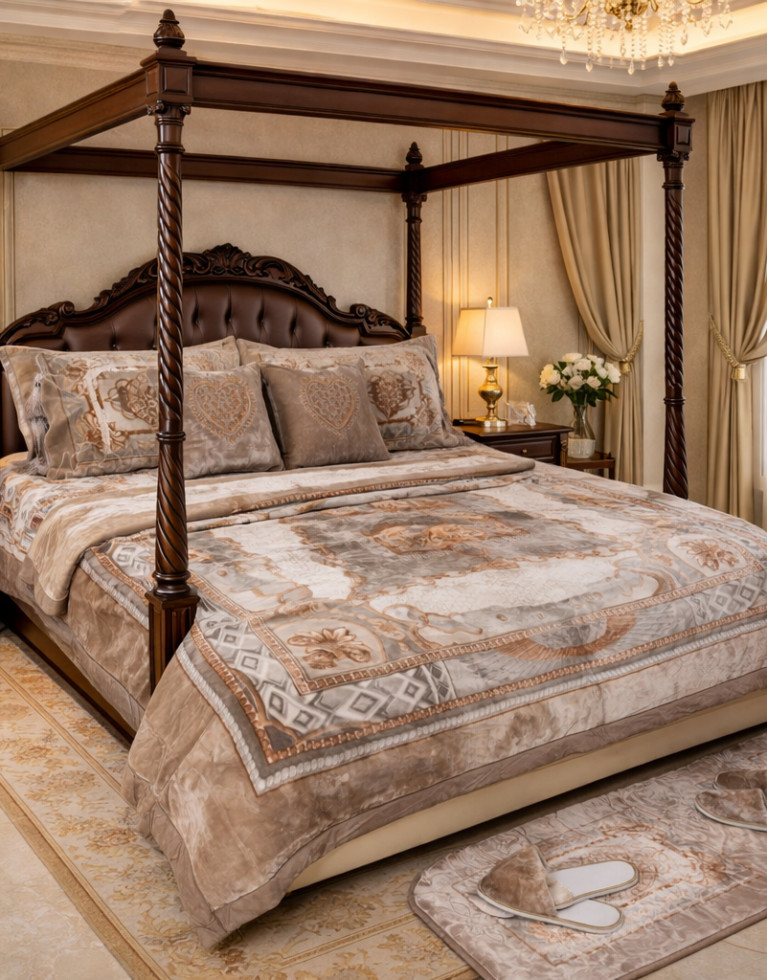 Indulge in timeless elegance with the Saga Wedding Collection bedsheet set in a rich maharaja golden- brown tone. A soft touch velvet fabric, featuring ornate heart and heritage-inspired motifs, this luxurious 10-piece set adds warmth and regal charm to your bedroom. Crafted for comfort and visual appeal, it is perfect for weddings, festive décor, and elegant gifting.