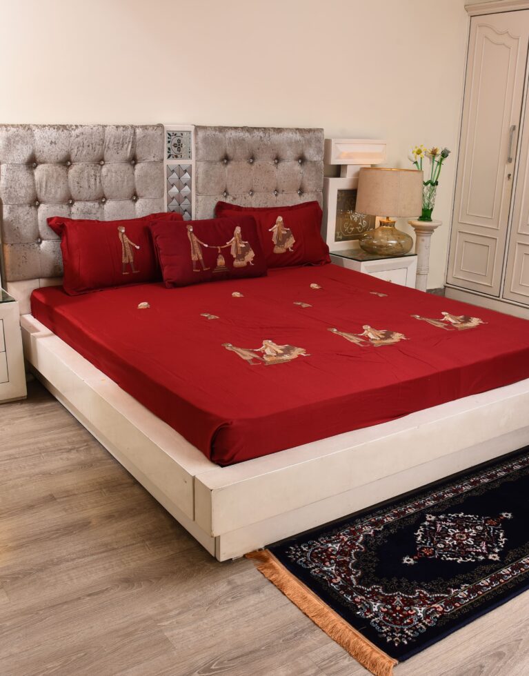 Celebrate timeless romance with the Royale Phere Wedding Bedsheet Set, crafted in a rich deep red hue and adorned with exquisite hand embroidery inspired by traditional wedding rituals. The intricate bridal motifs add regal charm, making it a perfect choice for weddings, special occasions, and festive décor. Soft,