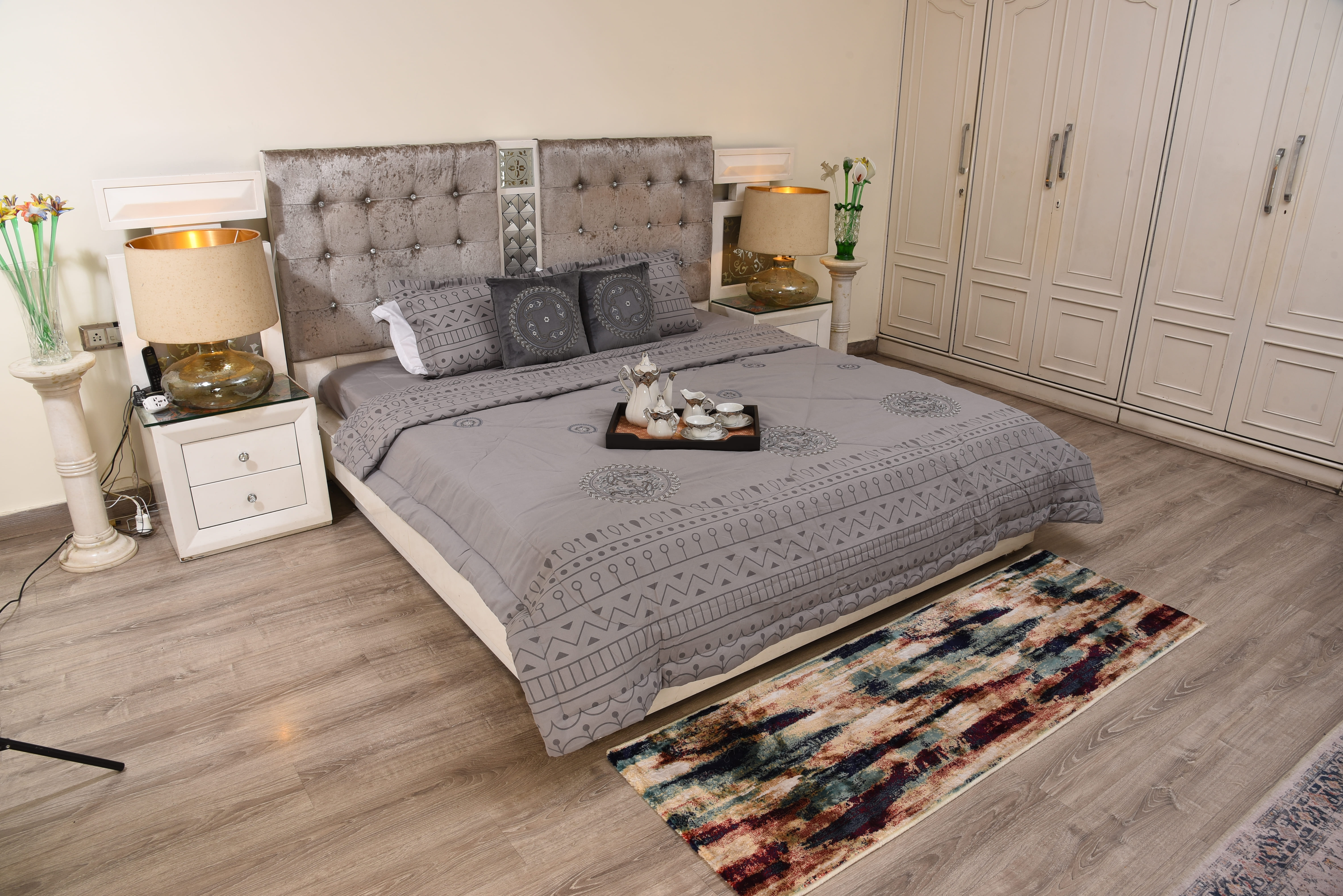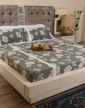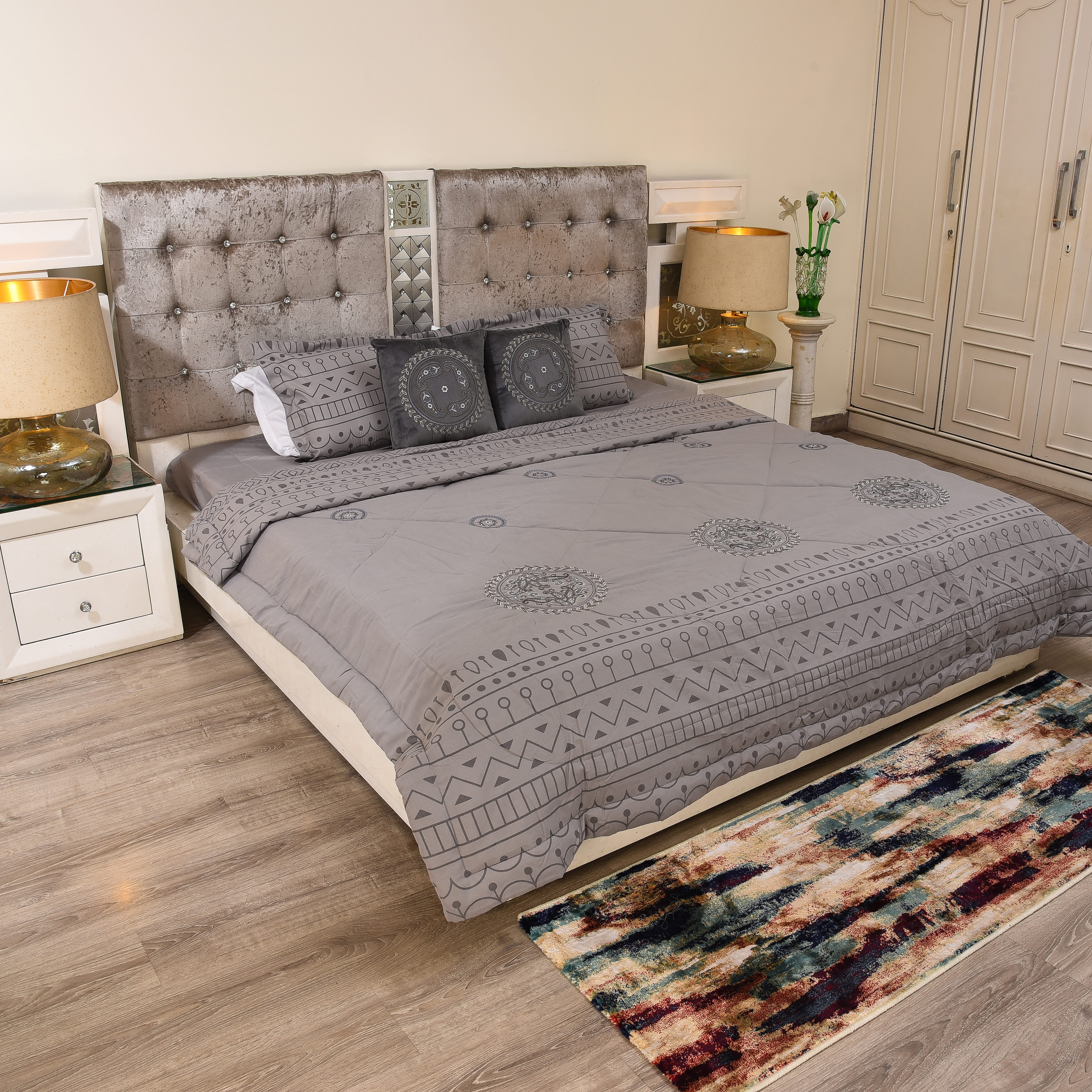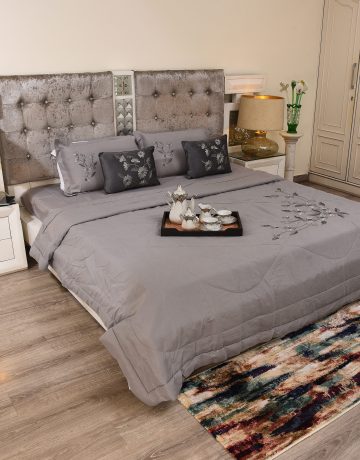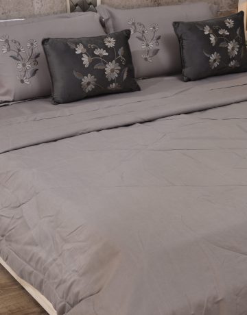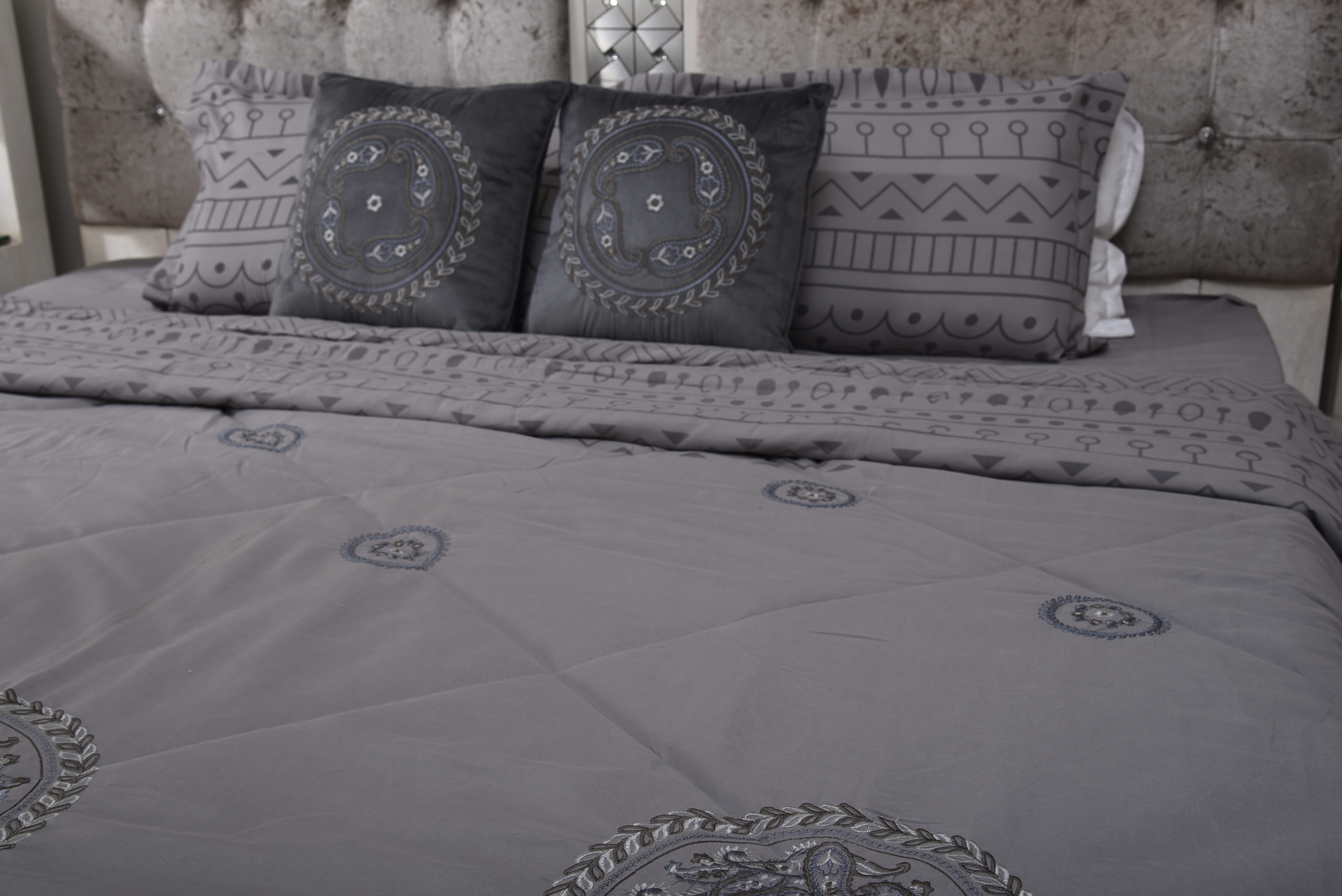 A muted grey bedsheet featuring refined tribal embroidered motifs and geometric borders.