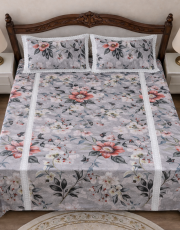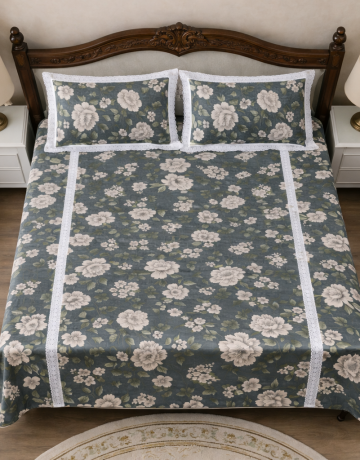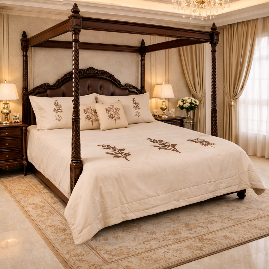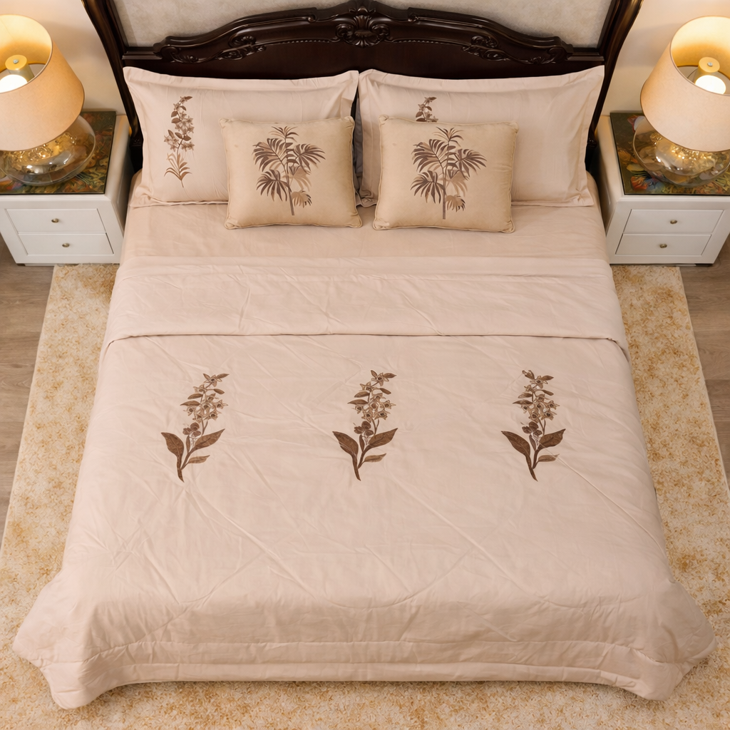 A serene ivory bedsheet accented with elegant palm and botanical embroidery.