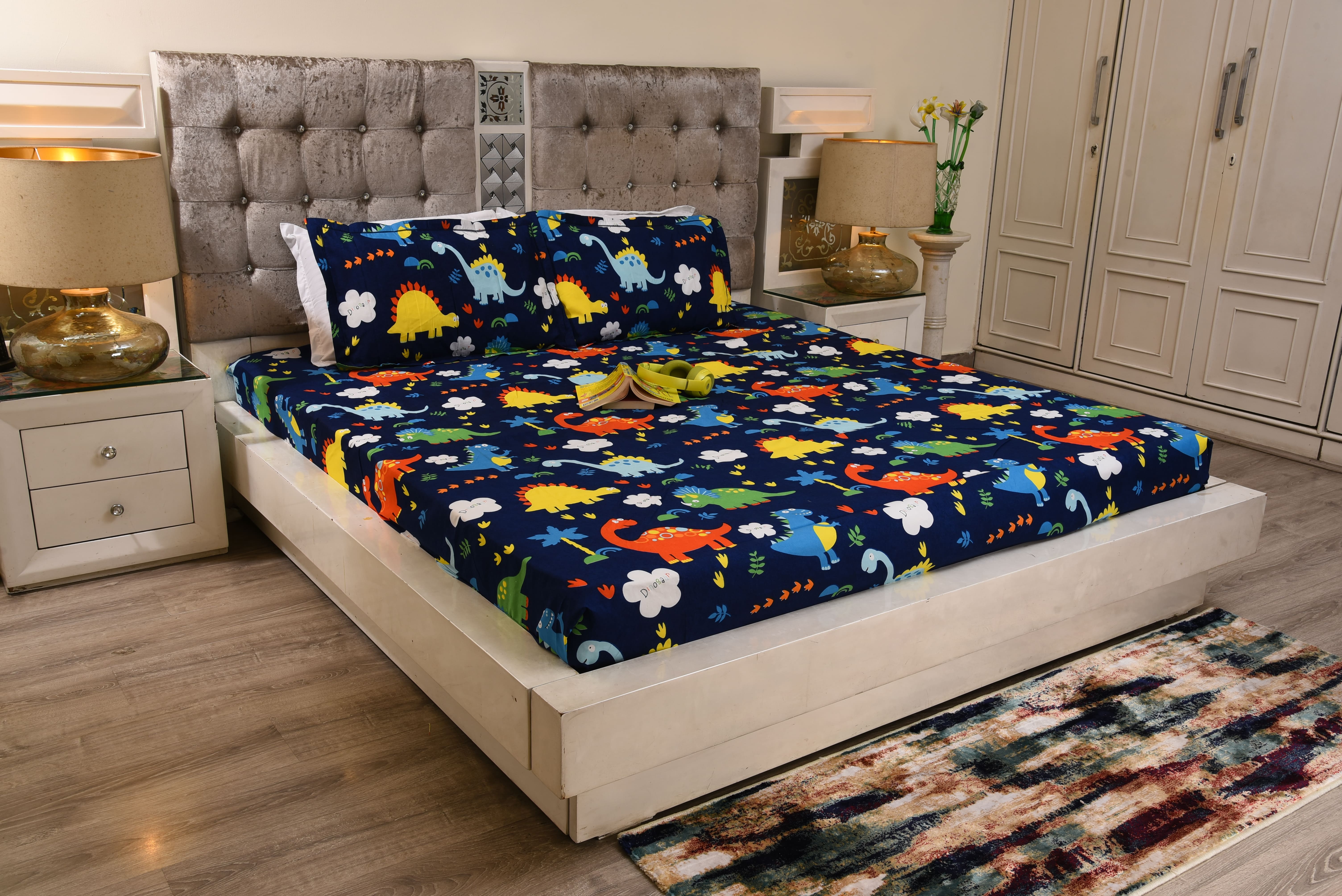 Turn bedtime into a fun adventure with this adorable dinosaur themed kids bedsheet. Featuring colourful, friendly dinos on a deep navy blue base, this soft cotton bedsheet is breathable,