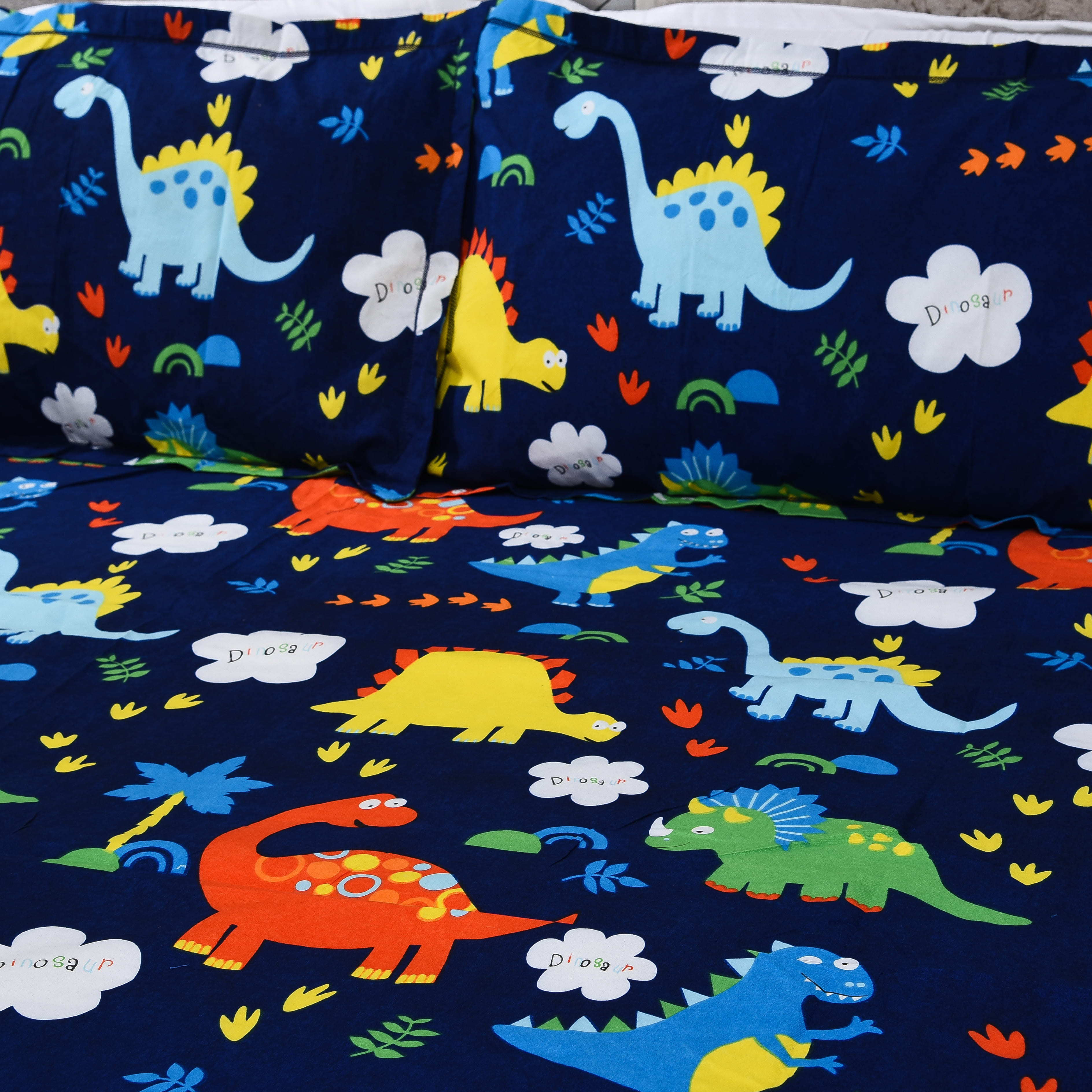Dino Dreams Kids Bedsheet Set – Navy Blue | Cute Dinosaur Print | Soft Cotton Bedding for Kids