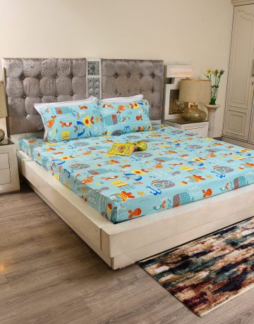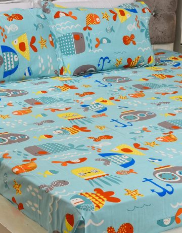 Ocean Adventure Kids Bedsheet Set – Aqua Blue | Fish, Boat and Anchor Print | Soft Cotton Bedding