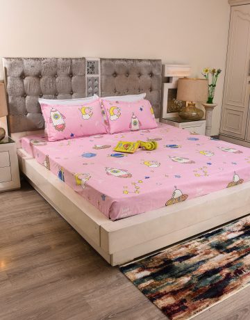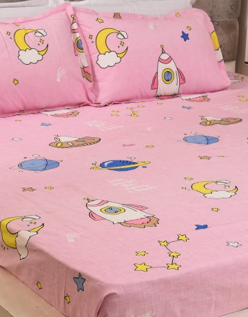 Dreamy Space Kids Bedsheet – Pink | Rocket & Moon Print | Soft Cotton Kids Bedding