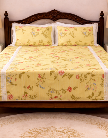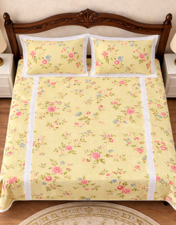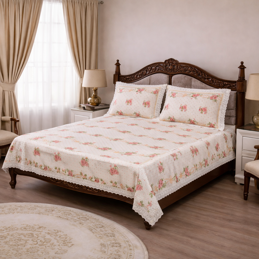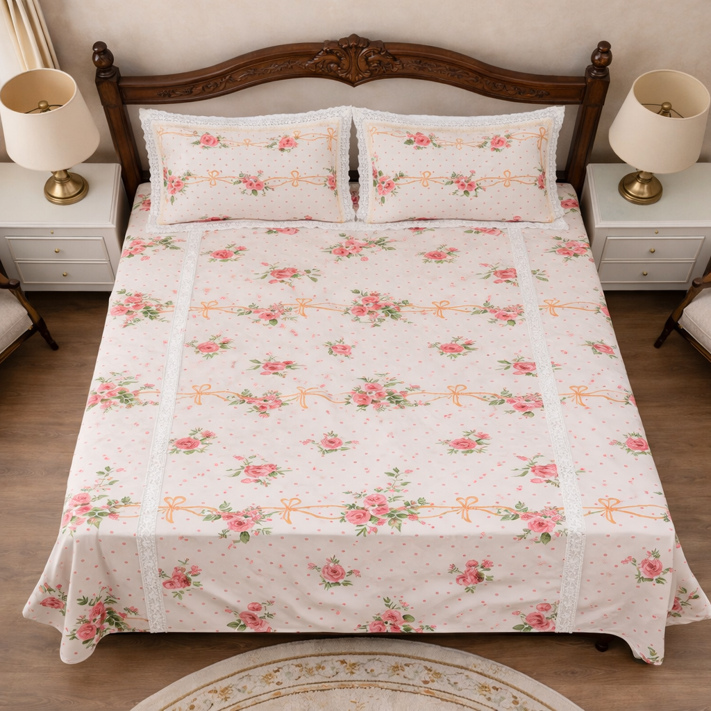 Classic rose florals paired with subtle polka dots and ornate lace trims create a charming vintage inspired