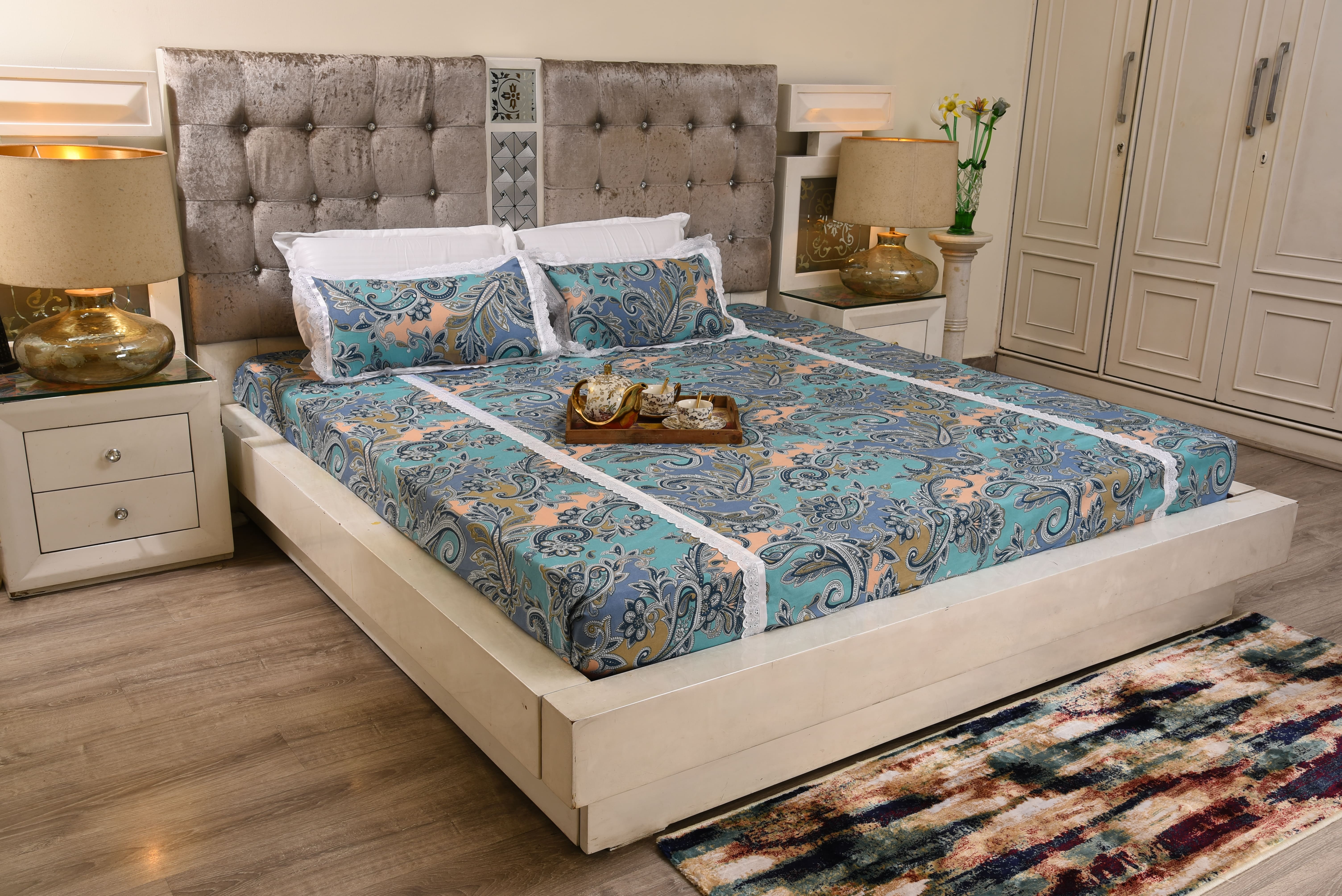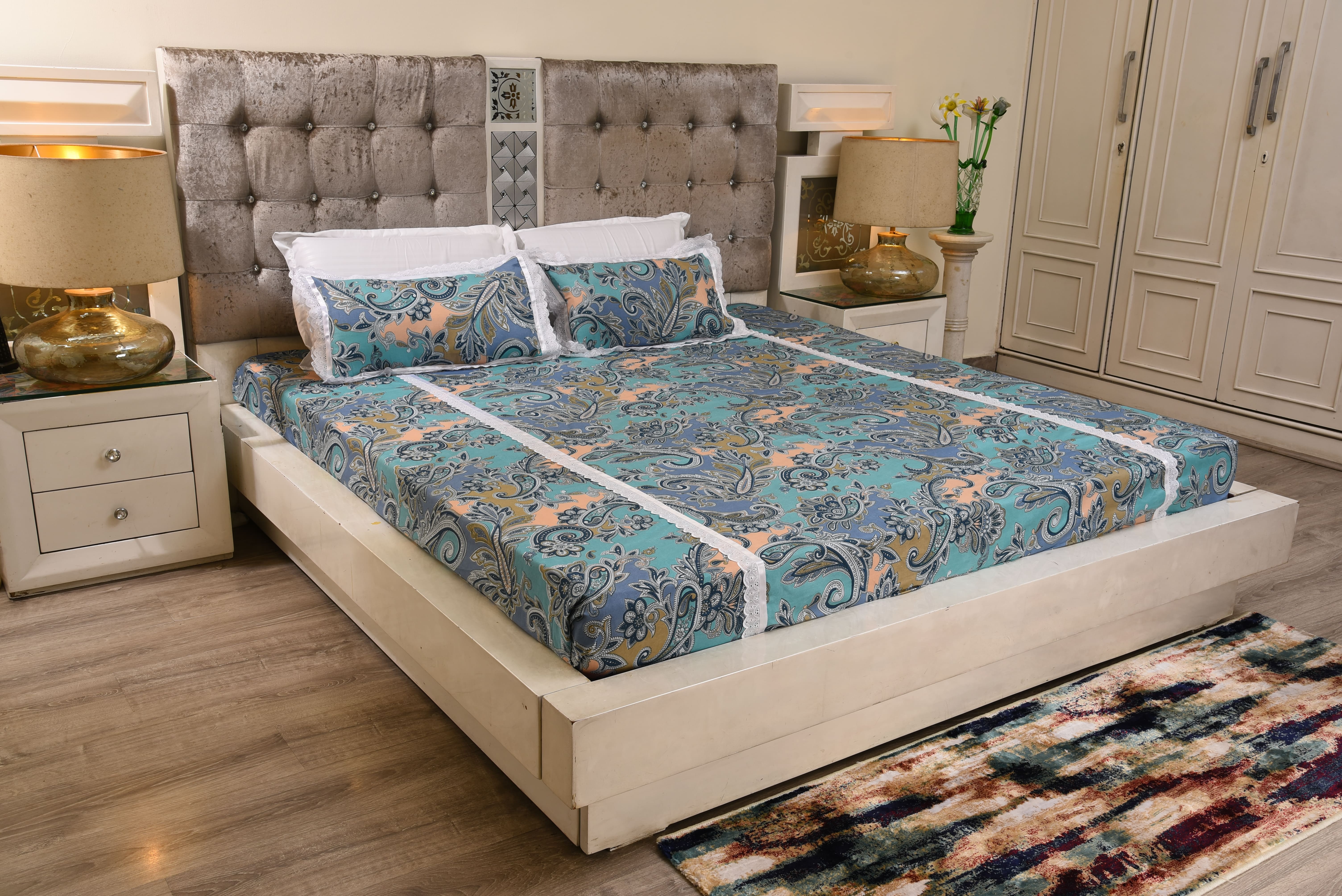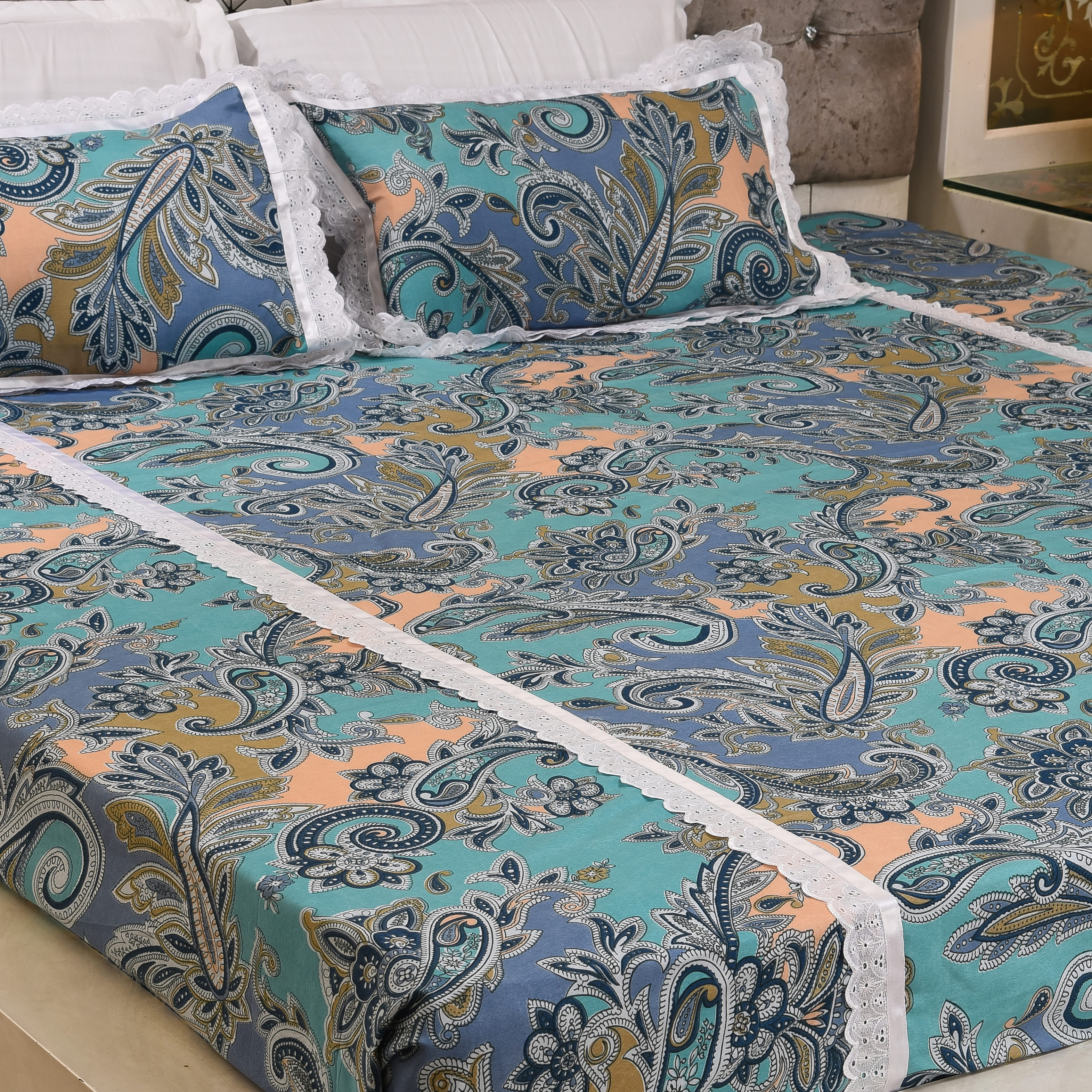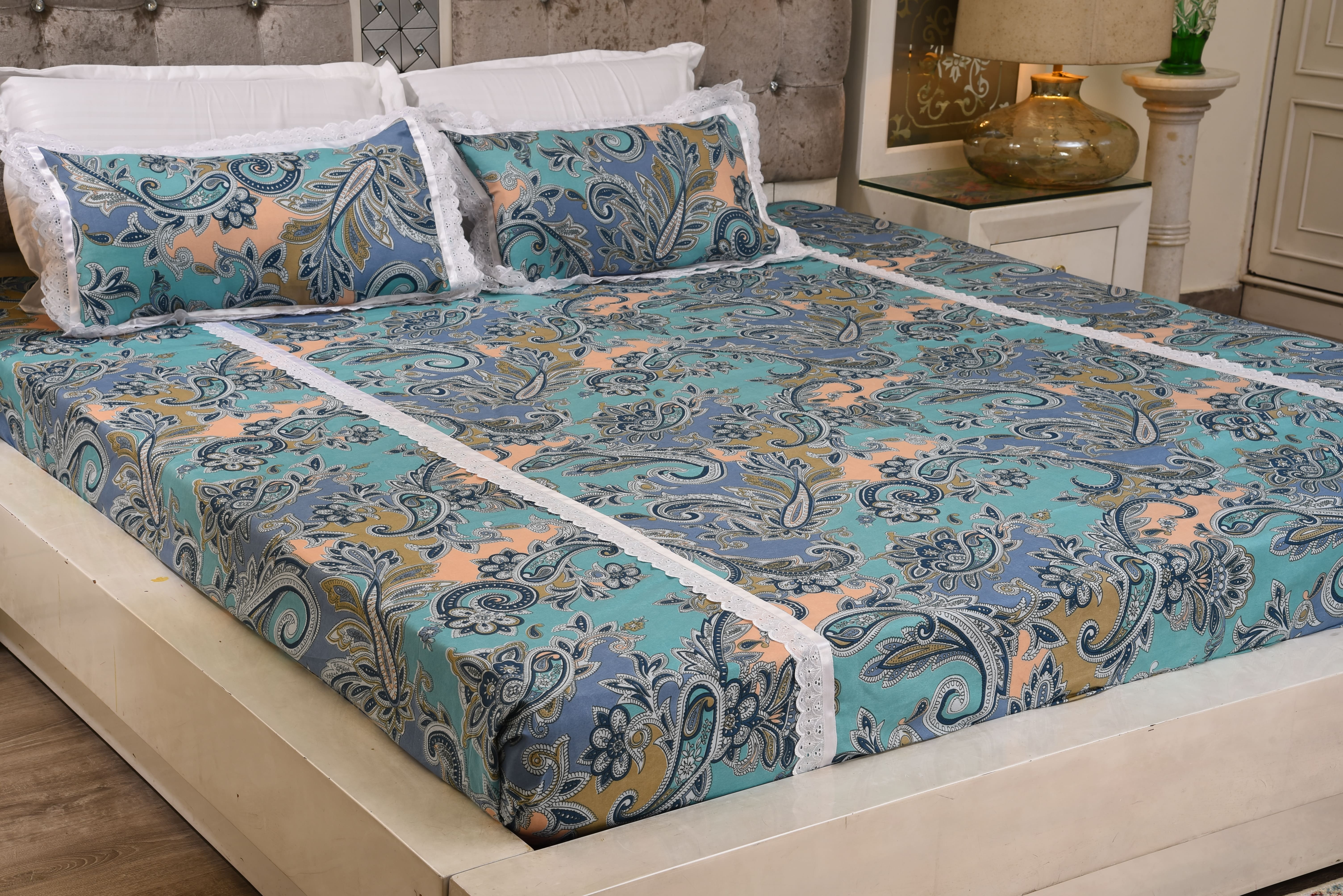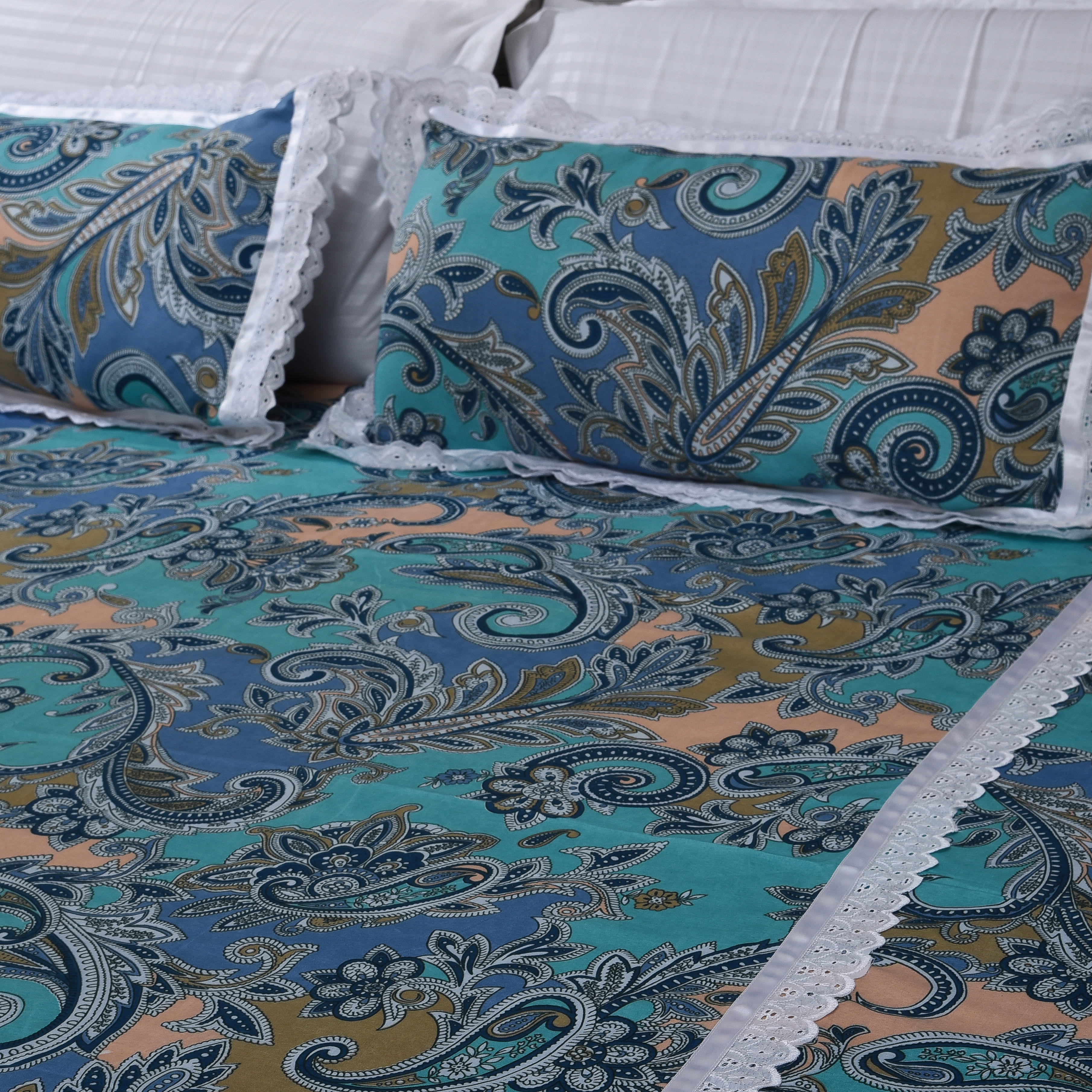 A rich teal bedsheet featuring intricate paisley motifs in layered blue and warm accents, finished
